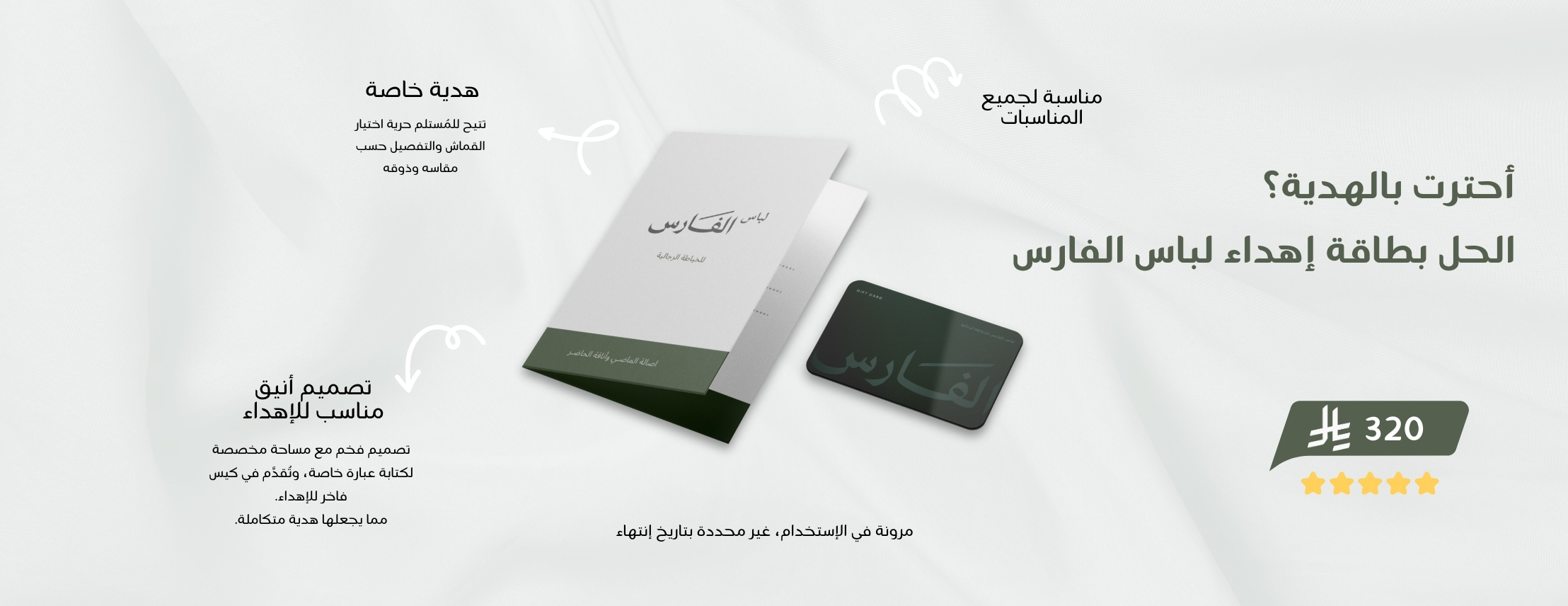 بطاقة الإهداء من لباس الفارس هي بطاقة مدفوعة مسبقًا بقيمة 320 ريال، تتيح للعميل استخدام الرصيد في أحد فروعنا أو عبر المتجر الإلكتروني لاختيار القماش والتفصيل حسب الرغبة. تم تصميم البطاقة لتكون أنيقة وسهلة الاستخدام، وهي مثالية لمن يحبون الهدايا المخصصة واللمسة الشخصية.